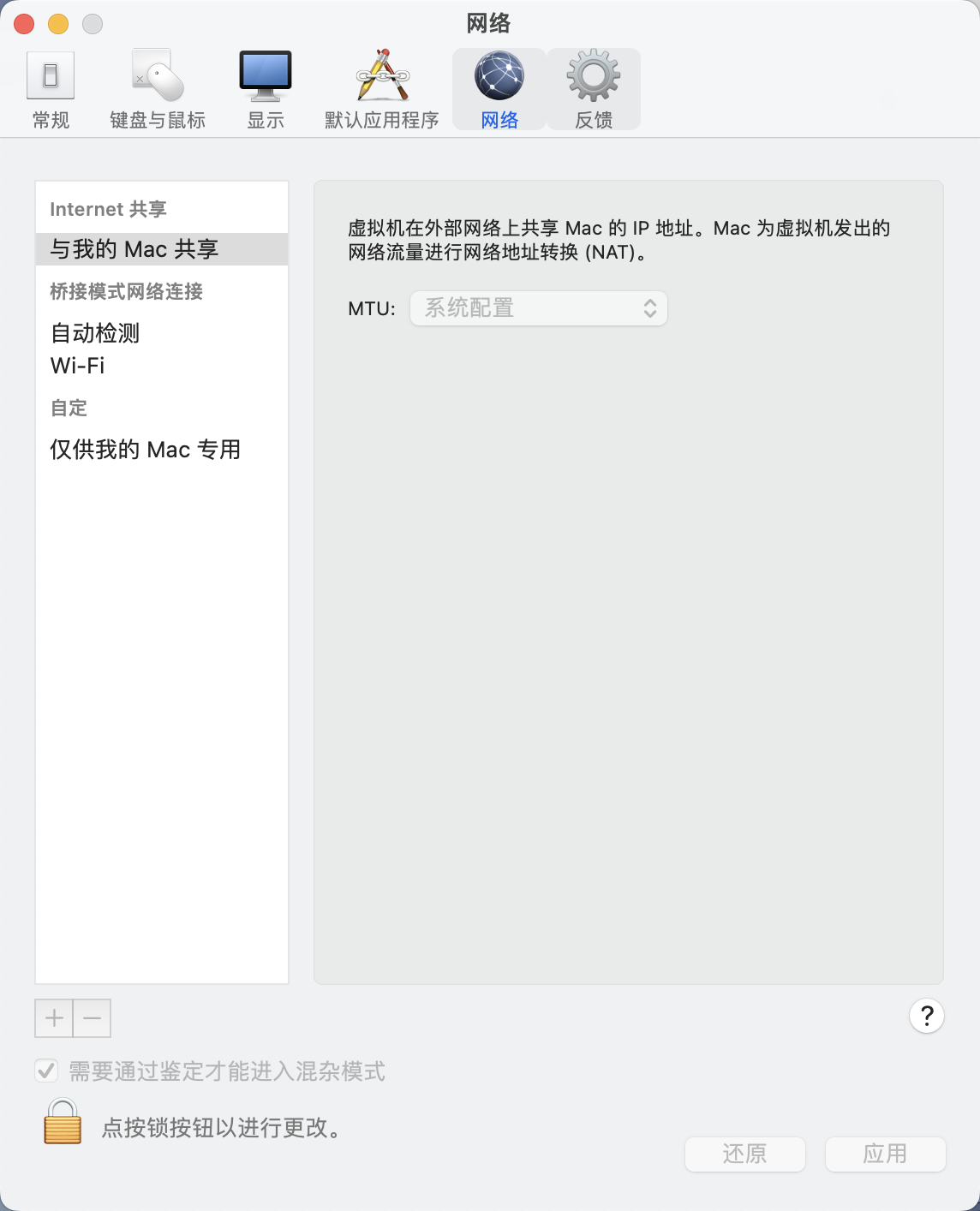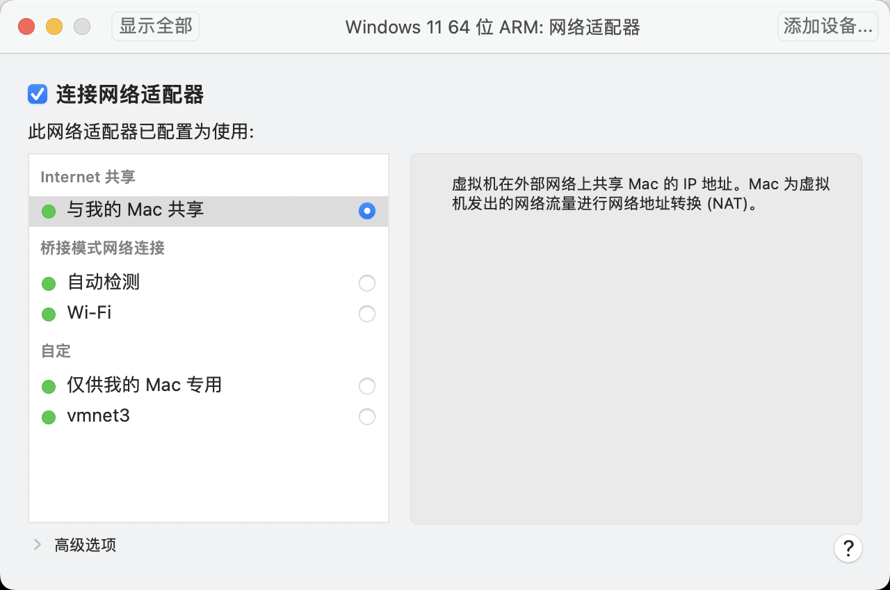 - 适用于需要虚拟机与主机 Mac 共享网络连接的情况,例如,需要使用主机 Mac 的网络连接来浏览互联网的情况。