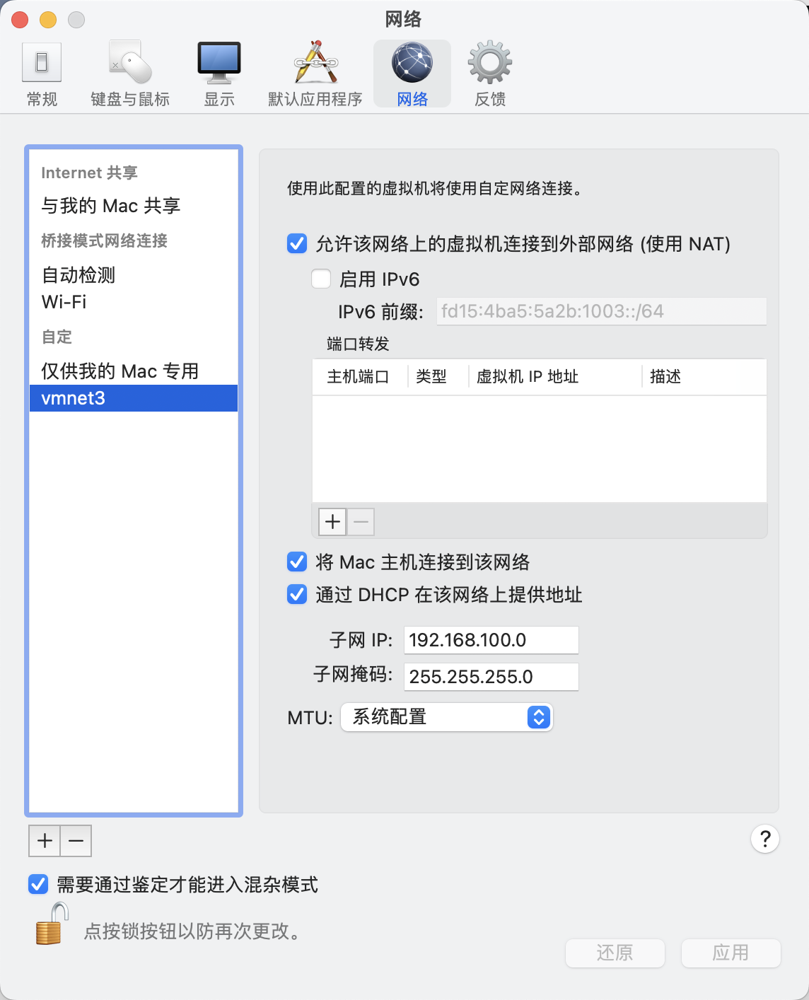 - 这个模式涉及到 VMware Fusion 的自定义网络配置,通常需要手动设置。您可以创建和配置自定义的虚拟网络(如vmnet3),并为虚拟机分配到该网络。这使得您可以精确地控制虚拟机与其他网络和主机 Mac 之间的连接方式。