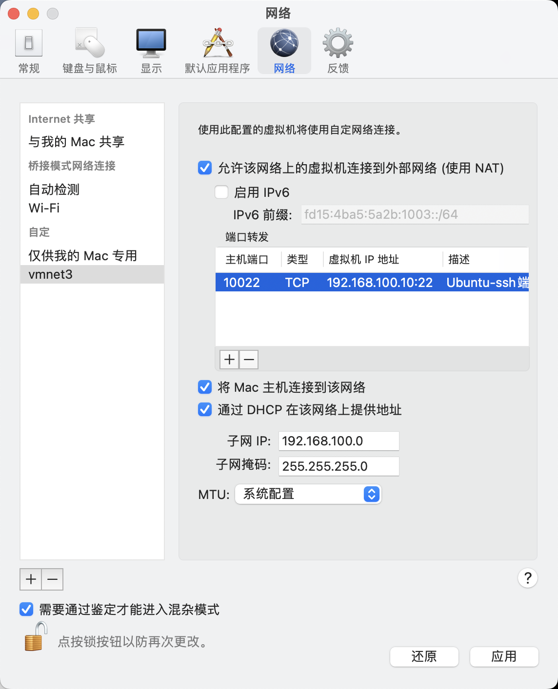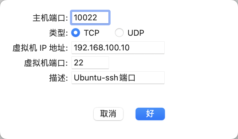 这时虚拟机内部配置好IP地址为 192.168.100.10 在宿主机连接 ssh -p 10022 root@localhost 则可以 SSH 连接虚拟机